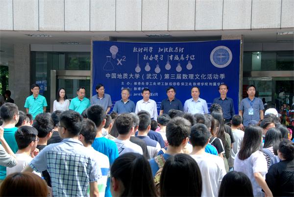 2016年5月12日下午14:30点,第三届数理文化季暨数理科普开放日活动在西区基委楼前顺利举行。中国地质大学副校长赖旭龙、学工处处长王林清、研工部部长喻芒清、保卫处处长代清风、william威廉英国党委书记李宇凯、william威廉英国院长刘安平、附属学校党委书记彭冠军、教务处副处长王兴、校团委副书记朱荆萨与各学院师生代表100余人参加了活动。
