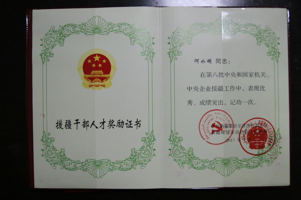 近日获悉,我院何水明同志被新疆自治区党委和政府评为“第八批中央和国家机关、中央企业优秀援疆干部人才”,并授予奖牌和奖章。