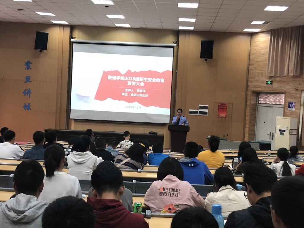 10月13日下午,数学与物理学院2018级新生安全教育大会在教三楼109教室举行,喻家山派出所熊家伟警官为学生讲授安全知识。2018级预科生、本科生、研究生共计300余人参加会议,会议由辅导员托乎尼牙孜主持。