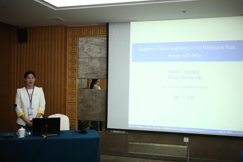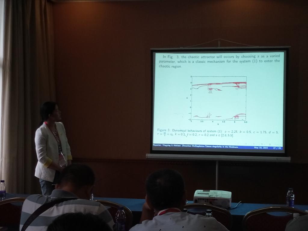 2019年4月19-21日,中国电子学会电路与系统分会混沌与非线性电路第二届学术年会在南京举行,荣誉顾问香港城市大学陈关荣院士出席会议开幕式。李影影同学参加了本次年会并作题为“Bogdanov-Takens singularity in the Hindmarsh-Rose neuron with tine delay”的学术报告,其主要成果发表在T2类期刊Applied Mathematics and Computation上。本次报告论文视角新颖、内容丰富,得到了与会专家学者的认可,并被评选为优秀论文。此次学术交流由国家自然科学基金项目(11772306)资助。