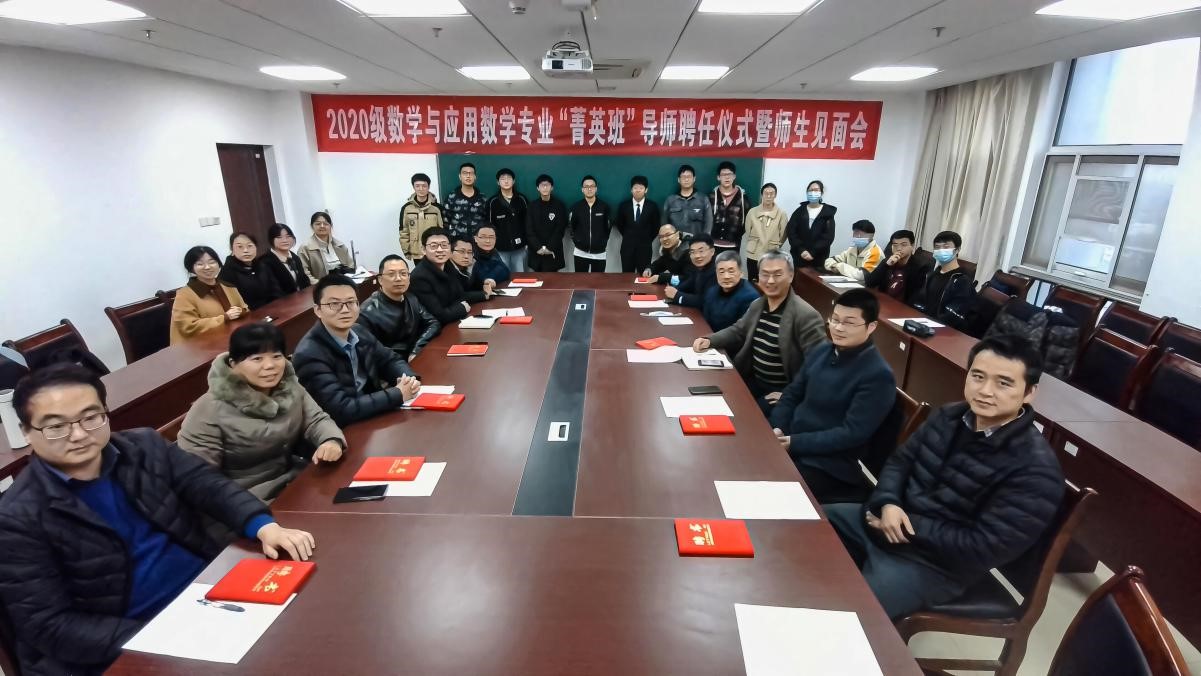 首届“菁英班”从2020级数学与应用数学专业本科生中选拔出17位品学兼优的学生,修订了专业人才培养方案,实行导师制,强调因才施教和个性化多样化培养 。3月25日,2020级数学与应用数学专业“菁英班”导师聘任仪式暨师生见面会在教学综合楼A1404会议室召开。吴太山书记、郭上江院长、中国科学院精密测量科学与技术创新研究院杨小舟研究员与曹高伟副研究员(线上)、魏周超副院长、黄刚副院长、全体“菁英班”导师、“菁英班”班主任李尚芝老师以及2020级“菁英班”全体学生参加会议。副院长魏周超主持会议。
