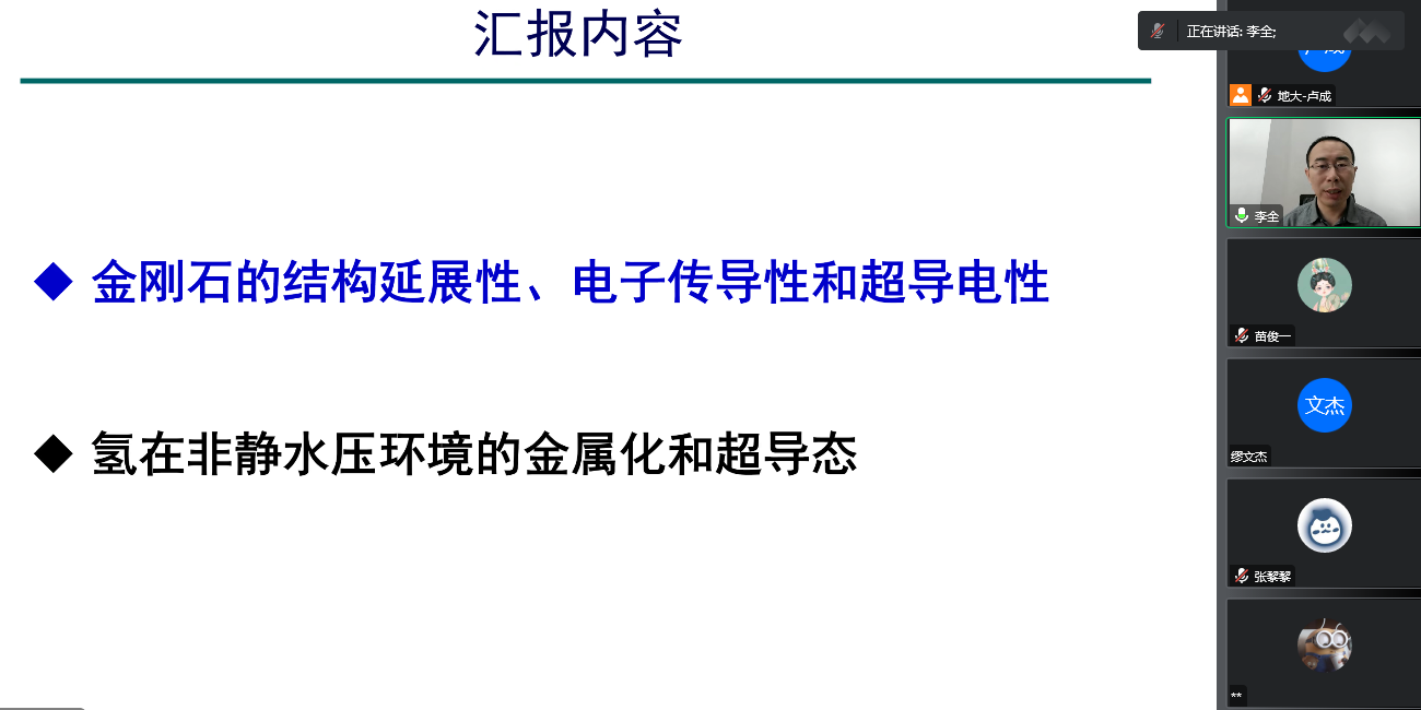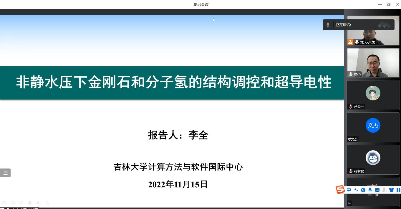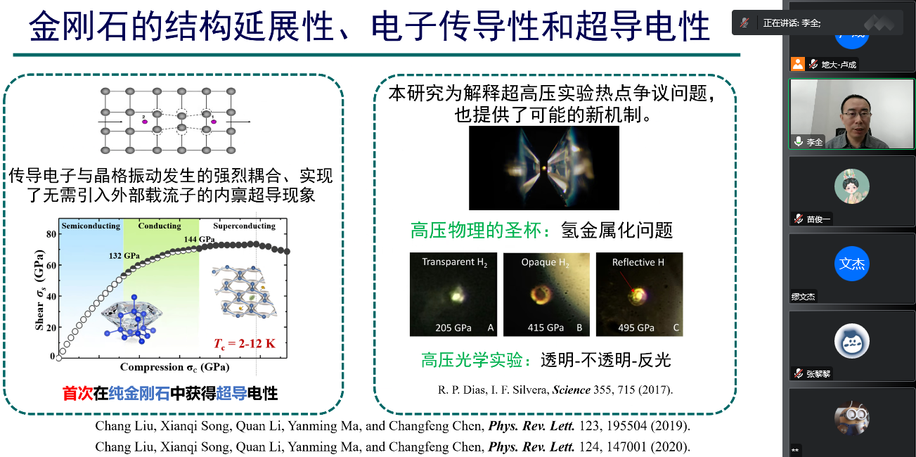 为迎接我校七十周年校庆,11月15日上午,数学与物理学院通过线上的方式,邀请吉林大学计算方法与软件国际中心李全教授,为我校物理系师生做了题为《非静水压下金刚石和分子氢的结构调控和超导电性》的学术报告。该报告由我校科学技术发展院、数学与物理学院联合举办,卢成教授主持,本院师生共计60余人参加。