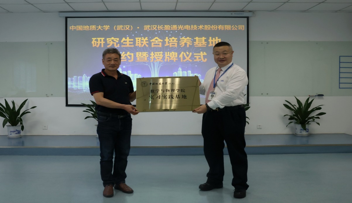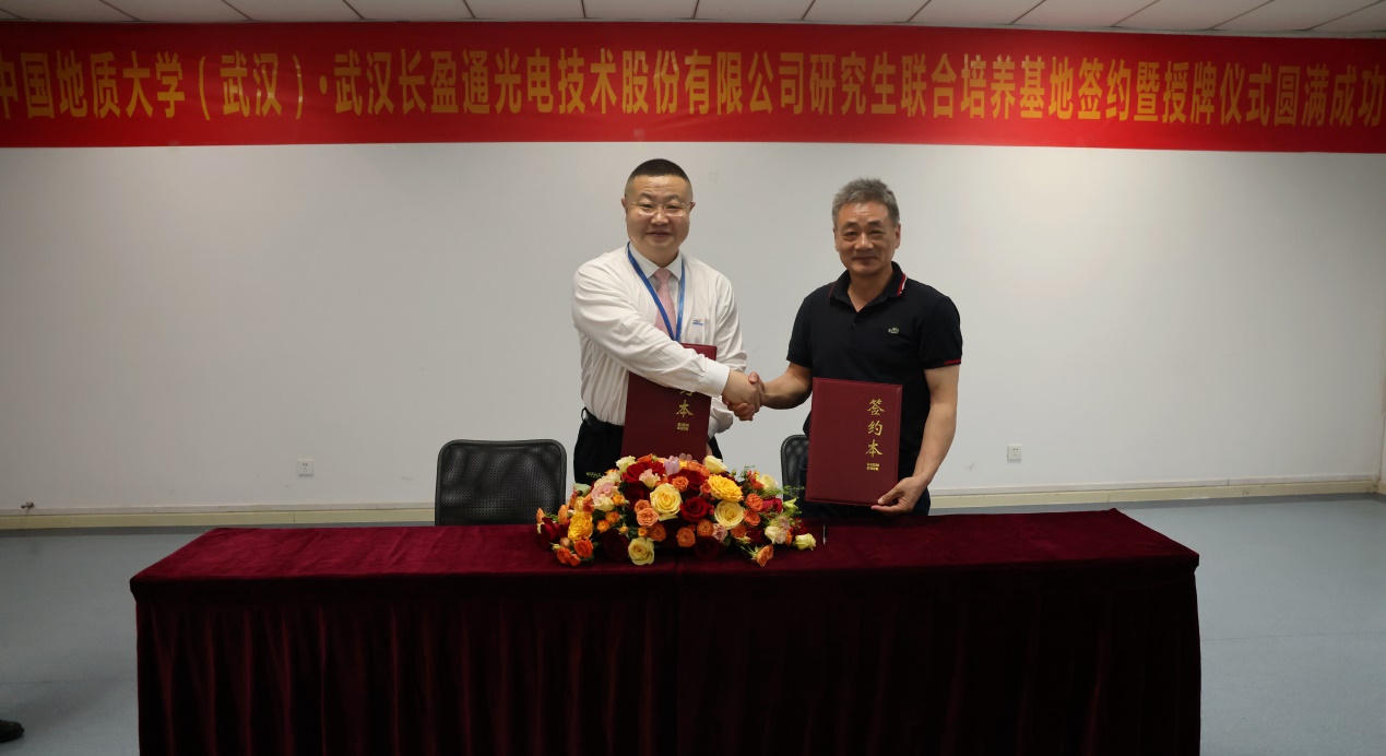 学院党委书记吴太山与武汉长盈通光电技术股份有限公司董事长兼总裁皮亚斌完成合作协议的签约仪式,并为武汉长盈通光电技术股份有限公司授予“实习实践基地”牌匾。