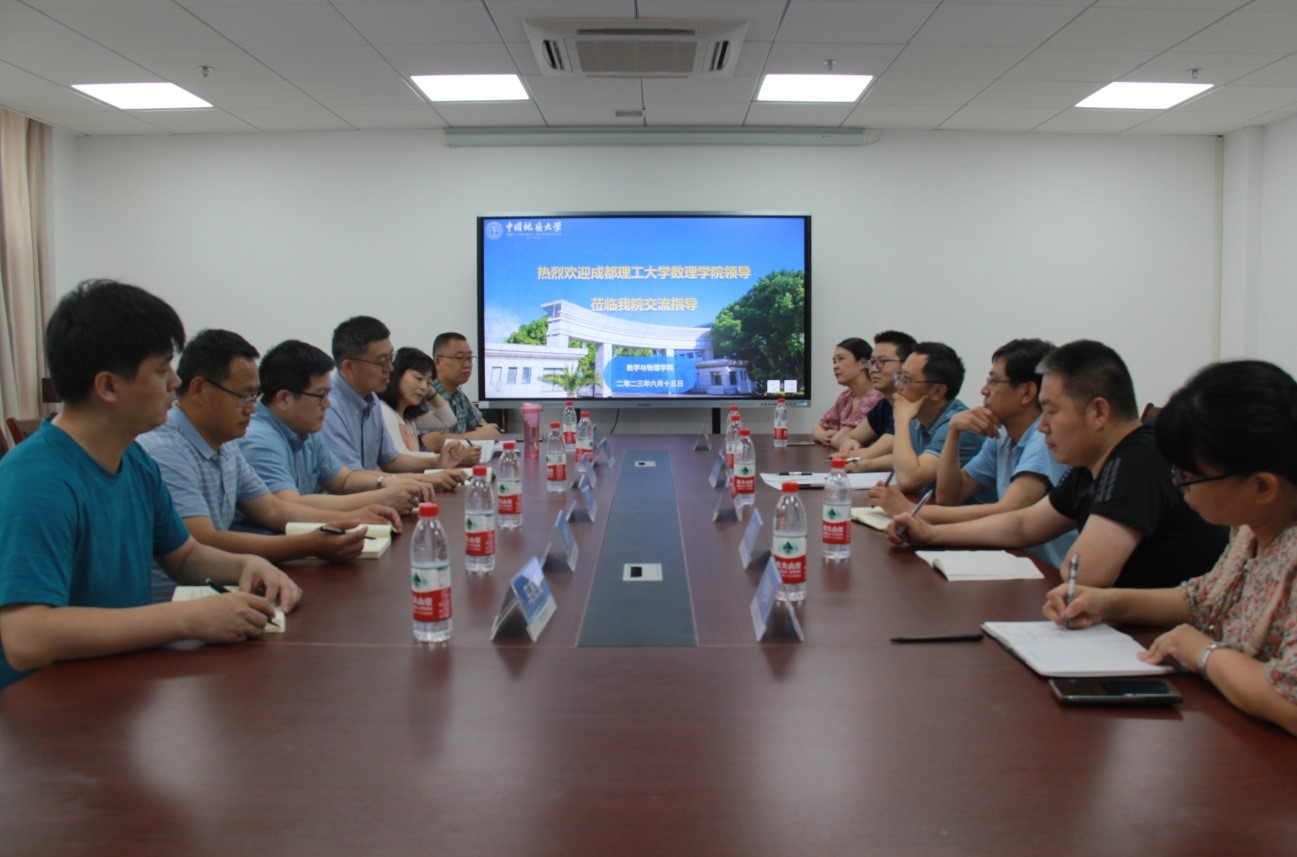 2023年6月15日下午,成都理工大学william威廉英国副院长张传瑜、基础数学教学部主任余海洋、基础数学教学部支部书记舒畅、大学物理教学部副主任史顺平、田荣刚等一行来我院进行工作交流。学院副院长黄刚、副院长张光勇、大学物理教学部主任陈琦丽、数学系主任王毅、大学数学教学部主任郭艳凤、物理实验中心主任何开华出席了此次会议。会议由副院长黄刚教授主持。
