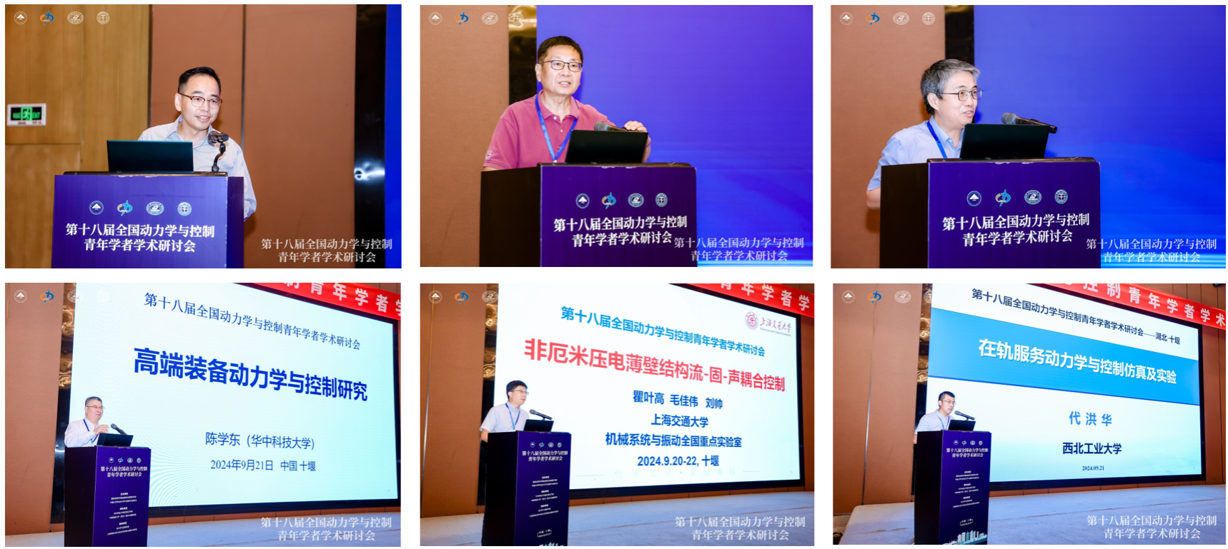开幕式后,作为特邀嘉宾,华中科技大学陈学东院士作了题为“高端装备动力学设计与控制技术研究”的大会特邀报告,上海交通大学瞿叶高教授和西北工业大学代洪华教授分别作了题为“非厄米压电薄壁结构流-固-声耦合控制”和“在轨服务动力学与控制仿真与实验”的特邀报告。随后,来自全国各地的15位青年学者各自汇报了自己的最新研究进展,并与参会学者进行了热烈的讨论。会议报告内容亮点纷呈,涉及当前动力学与控制研究中的仿生机器人、多场耦合、高维非线性降阶等热点研究方向。本次会议为动力学与控制领域的青年学者提供了一个学术交流与思想碰撞的平台,推动了数学、物理、力学、机械、船舶、土木、航空航天等领域的交叉融合与学术创新。