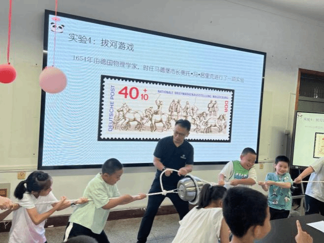 展演环节由吴妍老师接力,一场别开生面的科学秀火热上演。在看不见的大气压力演示中,“尺子魔法”让孩子们目瞪口呆:一张纸轻松“压制”悬空的尺子。吴妍老师揭秘:“这是大气压力在‘撑腰’!”紧接着,她拿出两个铜制半球,“这是曾经震惊世界的‘大力士挑战’!”随着半球合拢并抽走内部空气,她邀请力气较大的小朋友尝试拉开。孩子们憋红了脸使劲,半球却纹丝不动。“这就是著名的马德堡半球实验!”吴老师解释道,“大气压力就像无数只手紧紧压在表面,我们要对抗的是整个大气的力量!”孩子们恍然大悟,纷纷感叹大气压力的神奇。空气机关枪利用气流裹挟乒乓球射向空中,空气炮喷出烟圈滚动卷向远处的气球,孩子们跃跃欲试,亲自感受空气的力量。磁力魔法环节,磁铁间的吸引与排斥化作趣味游戏;静电飞花实验里,碎纸屑在静电作用下翩翩起舞;当静电遇上蛋挞铝托,蓬松的蛋挞铝托 “飞” 向空中,孩子们既惊讶又好奇,纷纷举手提问。吴妍老师耐心解答,将深奥的科学原理化作生动的故事,让知识在欢声笑语中传递。