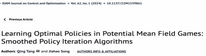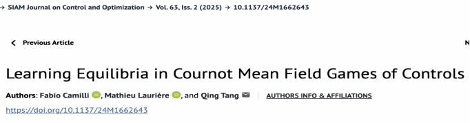我院信息与计算科学系教师汤庆博士作为通讯作者的工作 “Learning Equilibria in Cournot Mean Field Games of Controls” 最近发表于SIAM Journal on Control and Optimization。