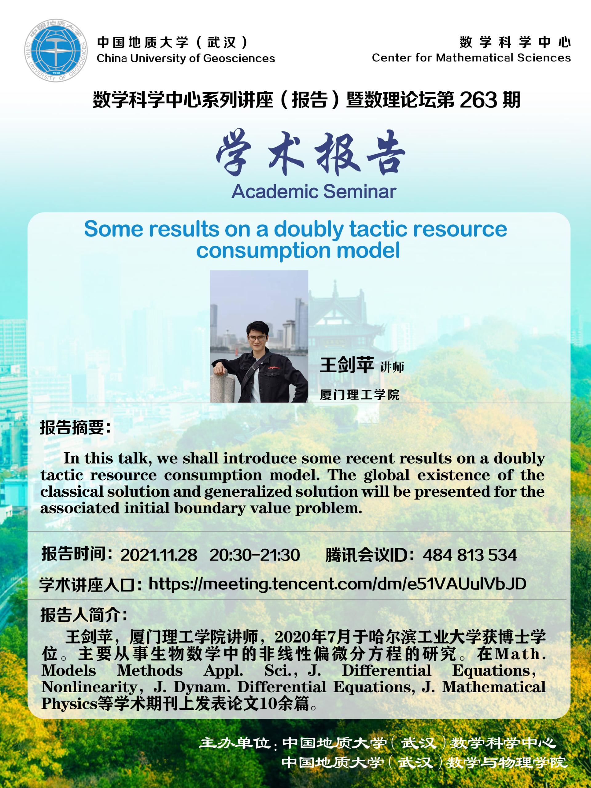 "数理论坛"第263期暨数学科学中心系列讲座(报告):Some results on a doubly tactic resource consumption model
